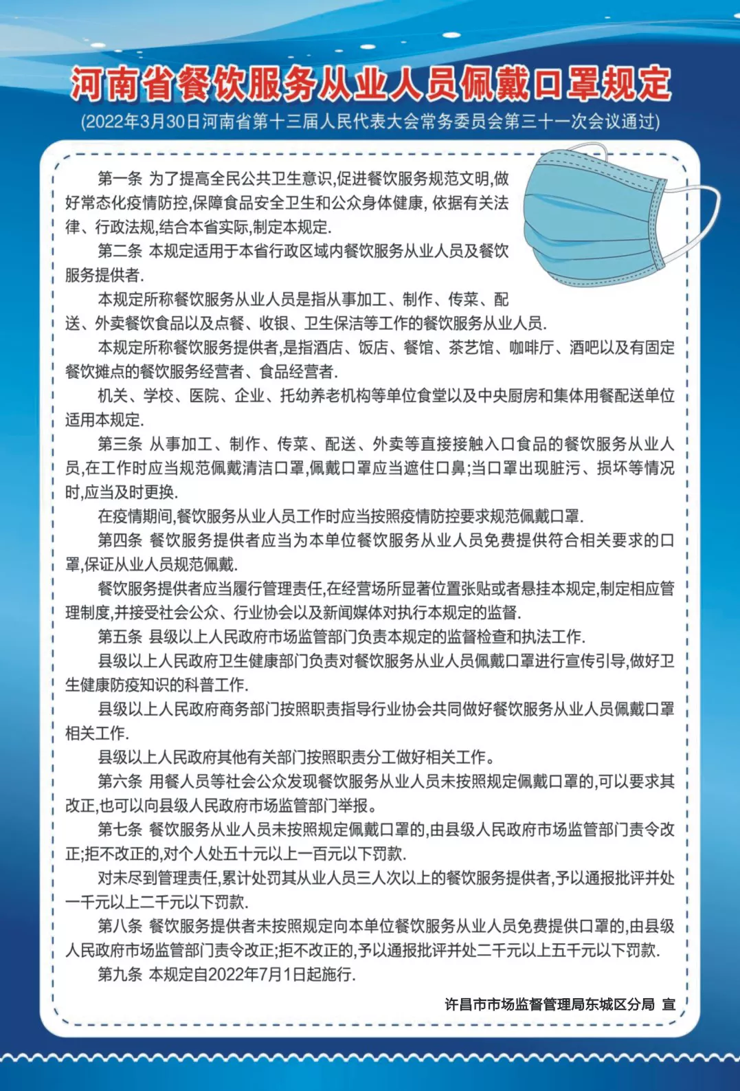 为贯彻落实好《河南省餐饮服务从业人员佩戴口罩规定》的各项要求,进一步强化辖区餐饮服务从业人员常态化疫情防控意识,促进餐饮服务业文明服务,切实保障食品安全和公众身体健康,自6月起许昌市市场监督管理局beat365在线平台网址_beat365官方网站正规_365be体育入口分局积极行动,印制宣传海报4000份,持续在辖区餐饮经营单位开展《规定》普法宣传工作。